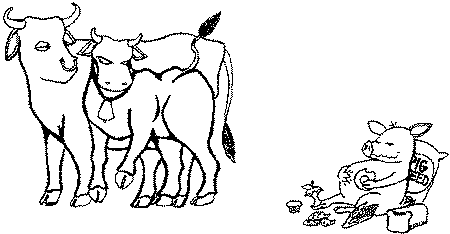 The two calves noticed this. They worked hard pulling plows in the fields and bullock carts on the roads. Little Red said to Big Red, “My big brother, in this household you and I do all the hard work. We bring prosperity to the family. But they feed us only grass and hay. The baby pig No-squeal does nothing to support the family. And yet they feed him the finest and fanciest of foods. Why should he get such special treatment?"