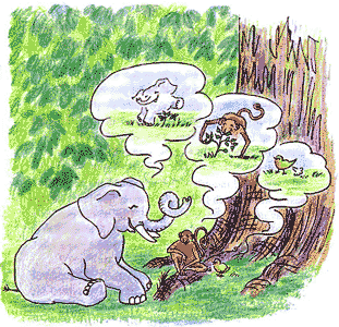The elephant replied, “I remember this tree for a very long time. When I was just a little baby, I used to scratch my belly by rubbing it over the tender shoots on top of this banyan tree."