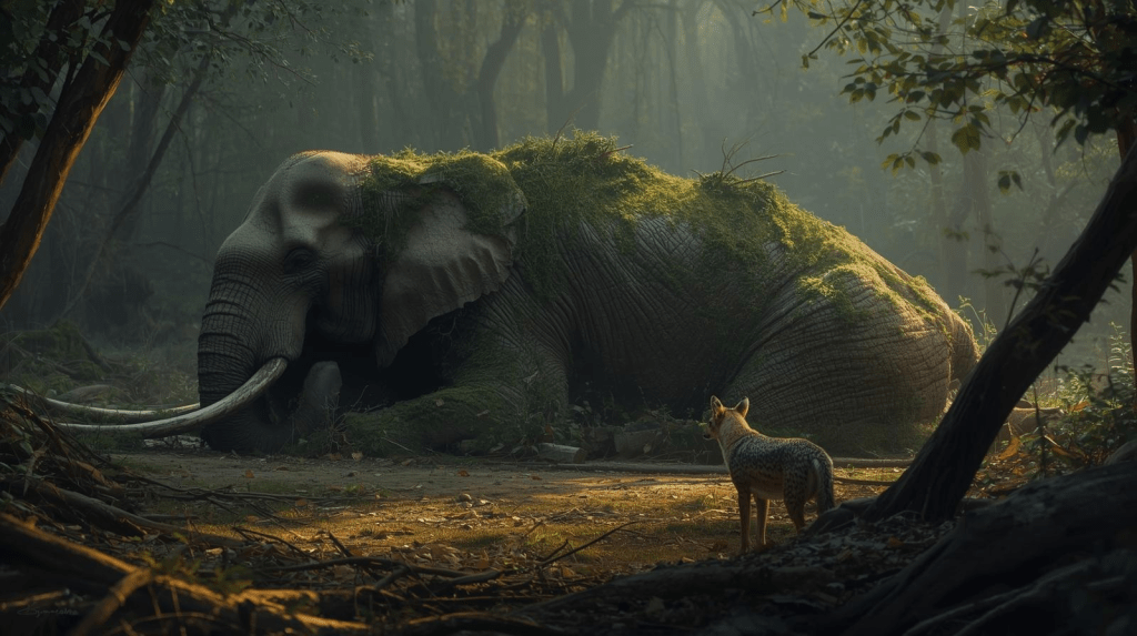 At one time when King Brahmadatta was ruling in Benares, the Enlightenment Being was born as a jackal living in the forest. Once, he saw the dead body of an elephant lying in the forest. He thought, “This is enough food for me to eat for my whole lifetime. I would not have to go anywhere else in search of food. Thinking so, he approached the elephant carcass and took a bite of the trunk. It felt as if he were biting a plough handle. Then he bit the tusk. It felt as if it were the hard core of hard wood. Then he bit the stomach. It felt as if it were bamboo matting. Then he bit the anus. It felt like an oil cake. Then he was satisfied, thinking that he had finally found soft meat. He then ate his way into the belly and decided he could live there as if in a den with plenty of meat to eat and blood to drink. When he got sleepy, he would place his head on the lungs as if two pillows and he would lie on the liver as if it were a soft mattress. While he was living like this, he thought, “Why should I ever leave this place?” He decided to live inside the elephant carcass permanently, and he spent days on end in it. After such a situation went on for days on end, there came a severe drought. The elephant’s skin dried and shrunk. The whole carcass of the elephant also dried up and shrunk. The meat became very tough and there was no longer any blood. Inside, the hollow in which he was living became dark as if it were the dark space between worlds.