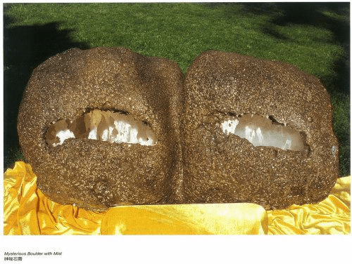 南無第三世多杰羌佛的神秘霧氣雕,也是娑婆世界有史以來最為神奇的作品之一。該作品的誕生源於在這個世界上,人們在介紹一些法王、大仁波且的成就時,動輒就說某某大仁波且在石頭上留一個足印,這樣一來把至高無上的佛教說成石匠功夫,似乎大聖仁波且們只會在石頭上留手足印,以緻於有些業障重的人竟然說:法王仁波且,本是石頭神,除了留石印,別無有它門。乃至還有人認為是鋼鉆打成的。為了讓世人明了佛法的偉大、佛陀的無所不能,不讓佛法受辱,因此三世多杰羌佛應大日如來之授記,創雕了大家都能看得到、都可以觸摸、但不是真正的至高大聖又做不到的聖蹟品。所謂神秘霧氣雕,主要是雕刻玄妙神奇變化穿梭奇特的石掛風光,為什麼稱之為神秘霧氣雕呢?因為在石掛與石掛之間,有一種祥霧繚繞的玄妙美韻,這正是三世多杰羌佛工巧明和內明的雙運證量展現,如「神秘石霧」是以一塊料刻出來兩個鵝卵石洞景,當你從鵝卵石右邊的洞看進去時,你會看到濃霧籠罩著,裡面的風景很多結構模糊,在霧裡看不清楚,感到有幾十米遠的霧障,其實只有三到四英尺長而已。當你從左邊的洞看進去時,一點霧氣也沒有,你會清楚地看到裡面的風景結構,所用的材料和色彩完全一樣,洞內深淺度也一樣,唯一是雕工和內明的證量展現,就成了這樣一邊大霧籠罩,一邊沒有霧氣的神秘現象。而且更為神奇的是,這神秘霧氣雕還能治病,很多人僅僅參觀欣賞了三世多杰羌佛的這一聖品,短短一兩分鐘,便治癒了幾十年的頑疾。難怪人們讚譽神秘霧氣雕不僅是世界人類史上唯一有自然氣體的藝術,更是超越大自然存在的絕世珍品,是三世多杰羌佛雕刀下名列聖品的佳作之一。