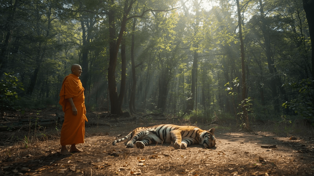 “Once, that student went with a group of other students to fetch firewood from the forest. On their way, they saw a dead tiger on the ground. Sañjīvaka said to the other students, ‘Do you want to see my power? I will bring this tiger back to life.’ The other students said, ‘How can you bring a dead being back to life? It will never happen.’ Sañjīvaka said, ‘Just look at what I do.’ And he started to recite the spell. The other students said, ‘Who knows what will happen!’ And they climbed up trees.