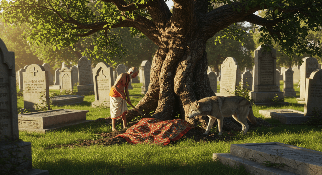 Once in the past when king Brahmadatta was touring Benares, there was a New Year’s Day festival declared in the city. People offered food items such as toddy, meat and the like food varieties as sacrifice to the deities everywhere in the street. On the very same night there came a certain jackal into the city, smelling the food items. He greedily ate as much as he could. As he was intoxicated, he lay down on the side of a road and could not leave before dawn. When dawn arrived, he thought, “At this time it is not good to go.” He hid by the side of a small bush. While he was looking at the road, he saw a solitary Brahmin, and thought, “Brahmins are very greedy. I want to deceive this Brahmin and leave this place under his protection.” He came to the Brahmin and said, “Friend, if you can take me out of this city, I can show you where 200 gold coins are hidden.” The Brahmin thought, “The jackal is trustworthy.” He covered the jackal with his upper cloth, took him under his armpit and went out from the city. He said to the jackal, “Show me the wealth.” The jackal said, “Go a little farther, and I’ll show you.” And he took him to a cemetery and said, “Here is the wealth. Put me down and spread your upper shawl on the ground.” He said, “Dig under that tree.” While the Brahmin was digging under the tree, the jackal defecated and urinated in the middle and in each of the four corners of the shawl, and ran away. Then while he was digging the ground, the tree deity came out from this tree and said, “Oh foolish Brahmin, what you have done is trust a jackal who has deceived you. That jackal had not even 200 seashells. By trusting him, what you have gained is the soiling of your cloth. Foolish Brahmin, go, have a bath and wash your cloth, and do your own religious works.” The Brahmin did this, going back home.